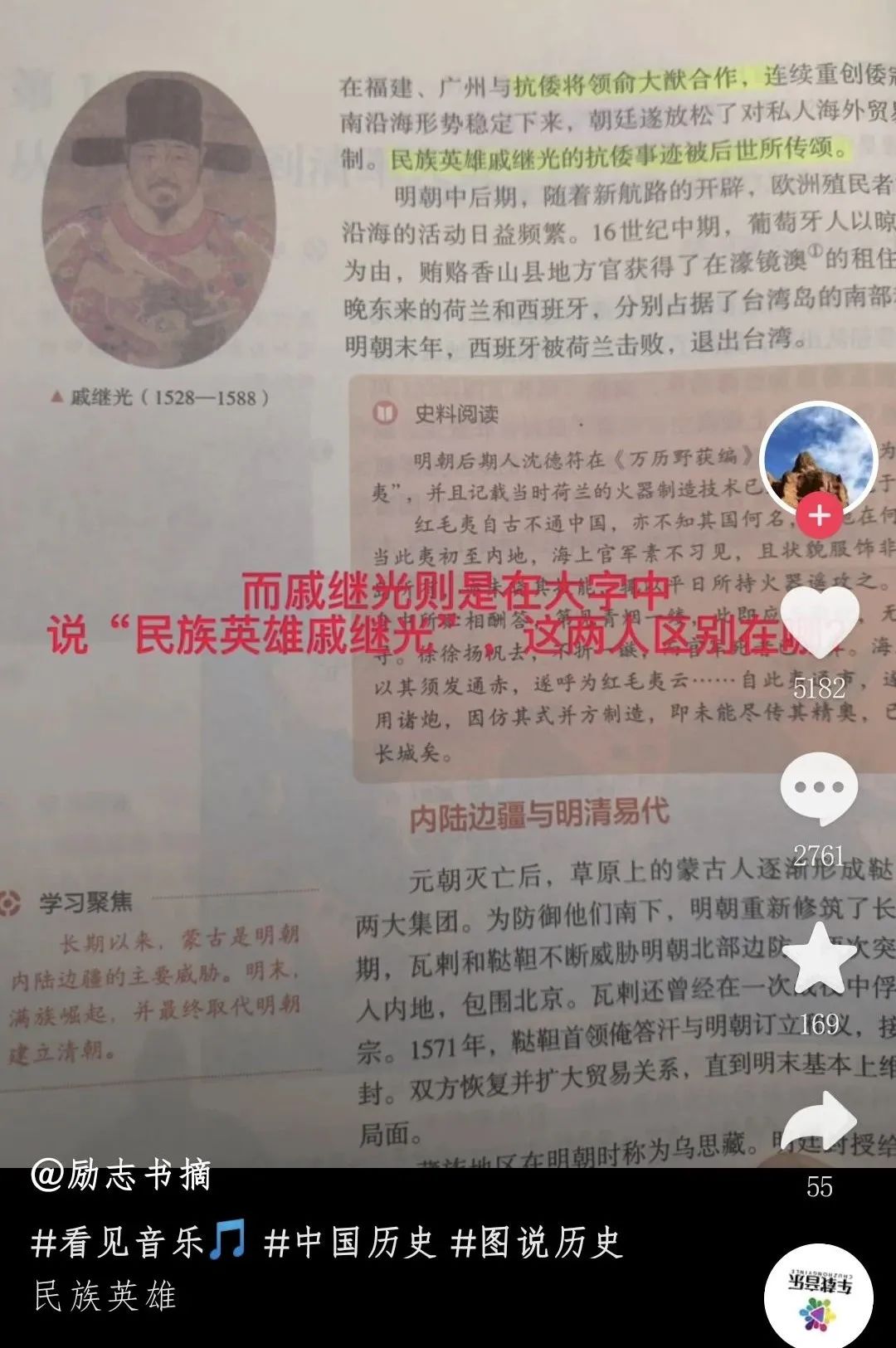 将教科书中的这一页和有关戚继光的那一页对比一下,就会发现这些个专家心里到底在想什么了。在戚继光这一页,专家们直接了当地说戚继光是“民族英雄”。