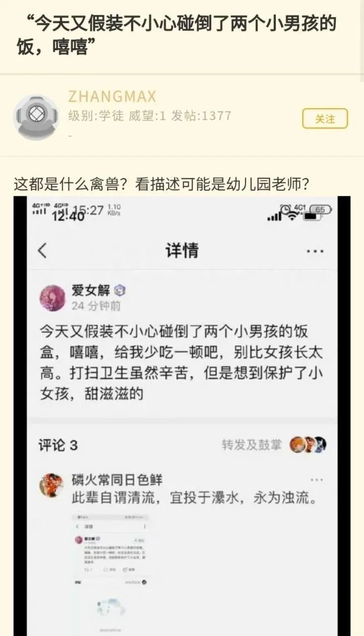 从如今的形势来看,女拳越来越疯魔,越来越肆虐,可以说根本不给国男生存空间。如今的女拳已经不再只是简简单单的作妖问题了,在这些人眼里,国男都不配呼吸了!笔者看来某个幼儿园老师发的朋友圈,她打翻了男童的饭碗,让男童饿肚子。在她看来,男性天生就有罪,即便是三岁小孩子也不肯放过!