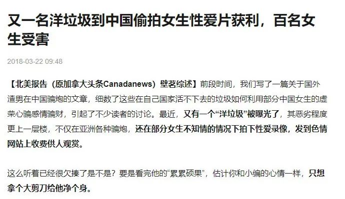 其实一些女同胞不用煞费苦心的贬低男同胞,虽然男性同胞遭受了你们无数的歧视和辱骂,但是他们依然希望你们能幸福!也许你们很难理解。西方国家丑化中国女人眯眯眼、丑装,国外黑人白人骂你们是easygirl,国男其实比你们更愤恨痛恨丑化你们的垃圾们!所以,我们才会不遗余力地揭露洋垃圾们的丑恶嘴脸,指出来华的外国人中有许多素质极端低下。一位洋垃圾在中国仅仅几年的时间,就起码追逐了几百名女性,还拍摄了照片和视频。