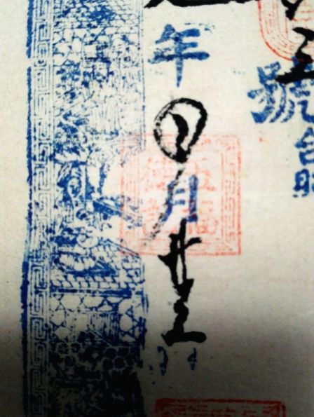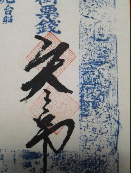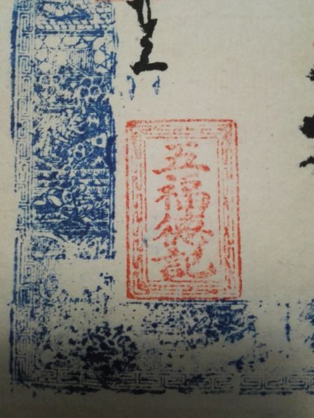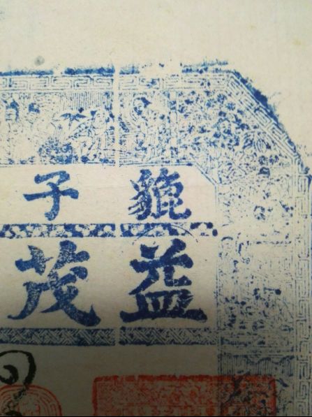 这是一张同治七年(1868年)貔子窝一家名为“益茂兴”的商号发行的“凭帖取街票钱”的钱票,宣纸尺幅为24X12厘米,蓝彩水印,雕刻古装人物细微精美,细看应为数块牛角板拼合而成。加盖一方朱文印,细辩识出是《滕王阁序》的片断,除开头两句与原文有变,其余只字未改。这种别有用心,恰好起到防伪作用。如果不小心,造假者就要被钱庄的东家有意带到了沟里。钱票上的数方押印都颇有讲究,“五福德记”、“槐香堂”以及盖在“参吊”之上的朱文名章都暗藏玄机。这有待时日,逐一破解。一吊钱,即为一贯,制钱为1000文,“参吊”即为三贯,3000枚“同治通宝”的价值在当时相当可观。“益茂兴”、“槐香堂”、“五德福记”这些都是同治年间貔子窝商街旺铺中鼎鼎有名的字号,然而不到二百年,往昔繁盛早已不再,空留一张商号承兑的钱票,供今人稽古钩沉,还原陈年旧梦。