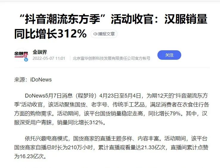 可以这么说,自从兴起以来,汉服运动的影响力越来越大,普通人也从起初的不理解变成了欣赏,越来越多的人开始穿越汉服走上街头。抖音官方过年期间发布了一组数据,2022年抖音“汉服”搜索指数同比增加162%,跟汉服相关视频发布639万条,播放量超320亿次。