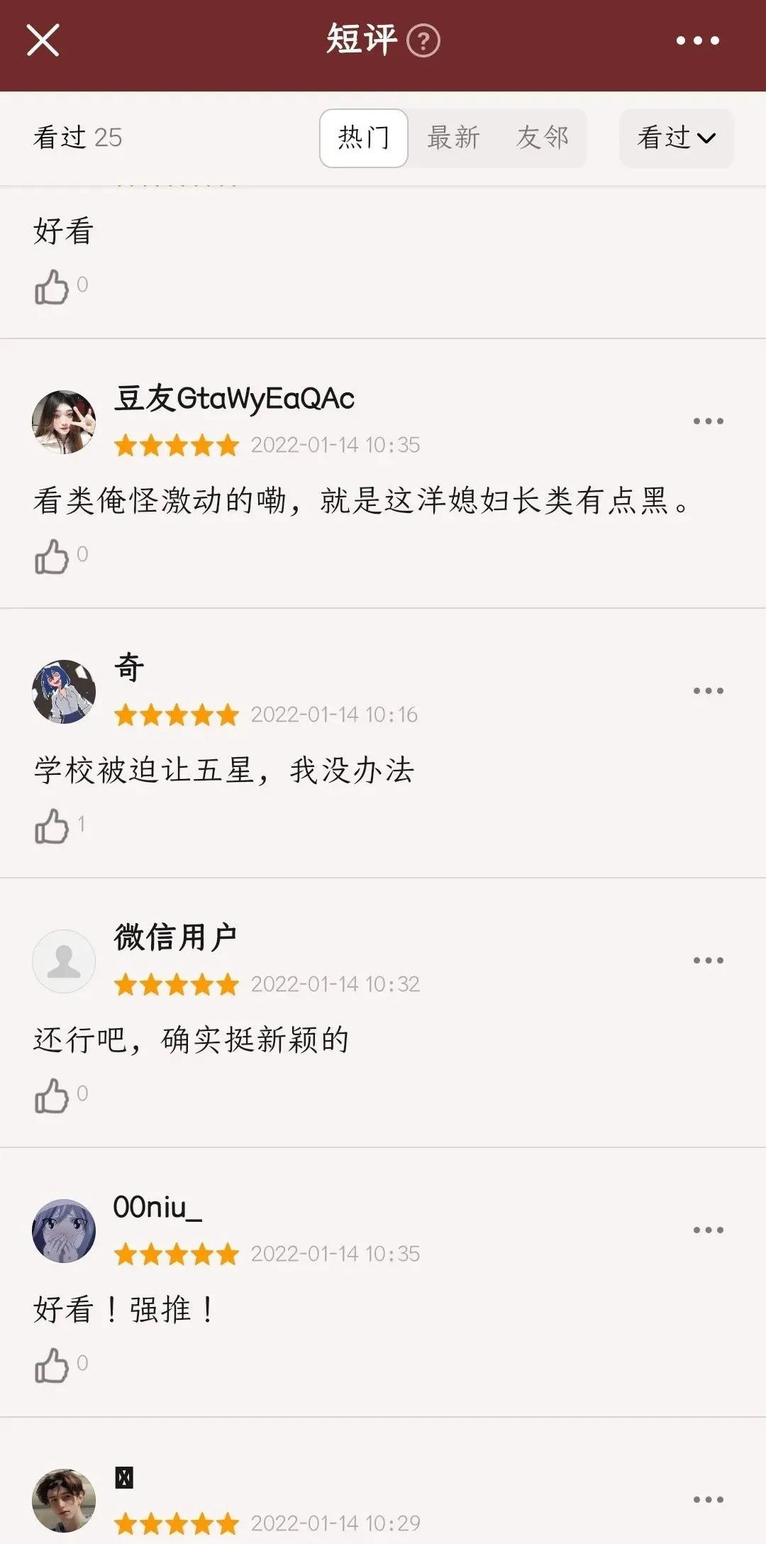 但是到了今天上午十点的时候,这部电影的短评区则变成了这样,最新的好评全是清一色的五星好评。