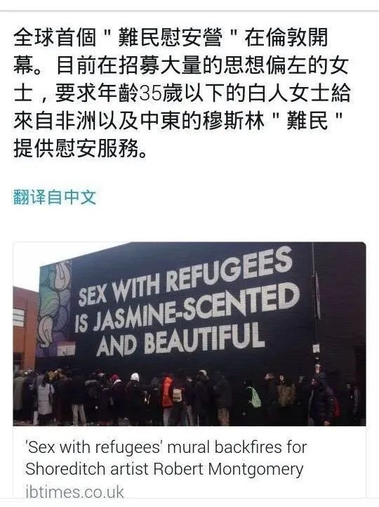 (英国《每日邮报》:阿富汗难民奸杀13岁少女后,企图逃往英国)白左圣母们给出的理由很是搞笑,他们认为难民们之所以这么做,是因为他们受到了歧视,是因为当地人对他们关心不够。这不,这些圣母竟然搞了一个“慰安组织”,招募35岁以下的白人女性主动慰安这些从非洲和中东来的难民,真是让人无法想象。
