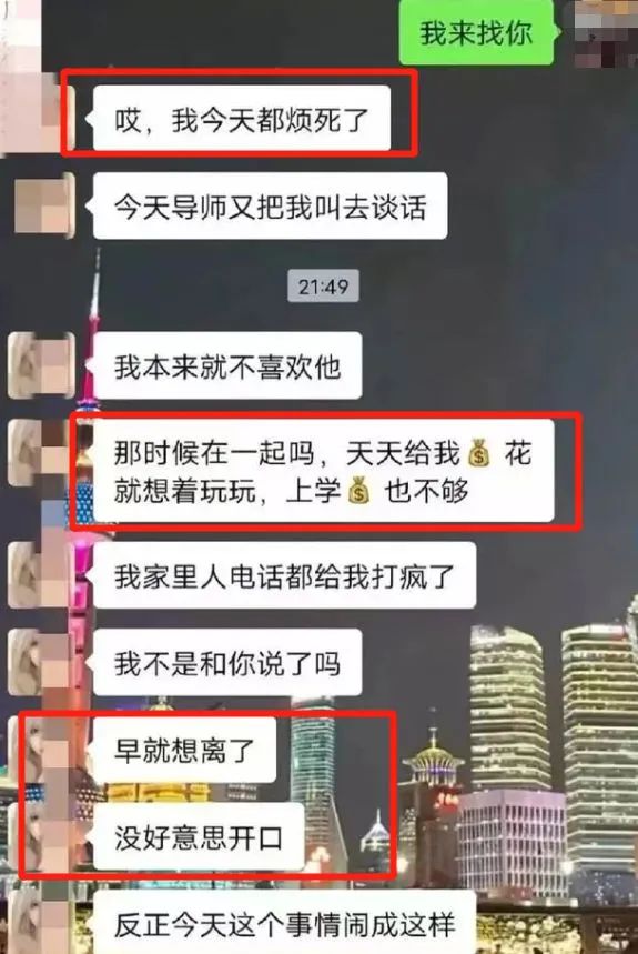 另外一张聊天截图显示,女方本来不喜欢男方,但因为和男方在一起可以得到经济上的援助,所以女方就暂时选择与男方“玩玩”,结果没想到男方“当真”了。这让女方感觉对方给自己找了很多“不必要的麻烦”。