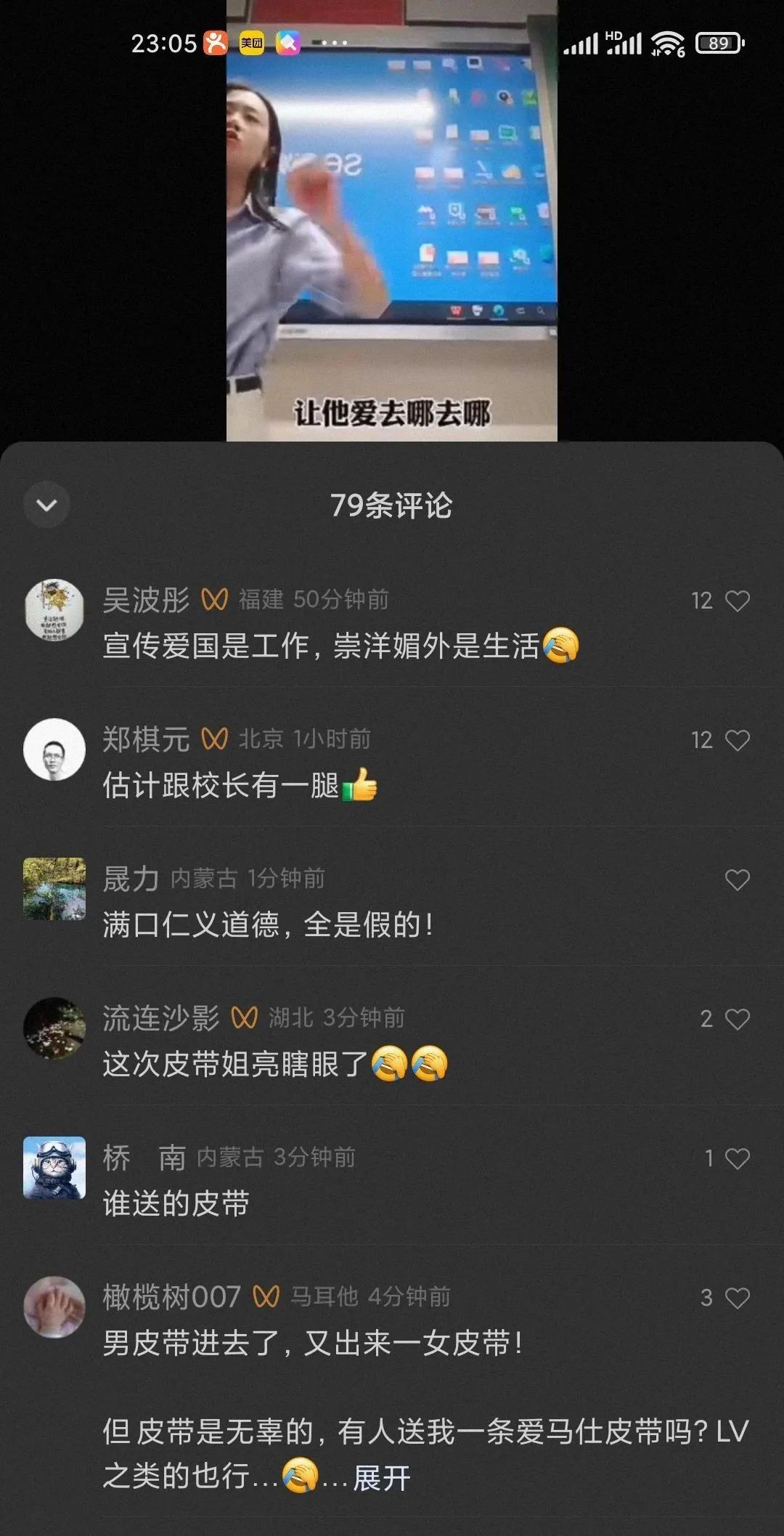 像以上那种皮带女,每天都在上映着他们的大戏,说到爱国,说到+能量一个个口若悬河,但只要听到民生、良知、不公事件,马上就噤若寒蝉——当一个群体中虚伪的人越来越多的时候,不要奢望整体道德水准和社会诚信等最基本的文明要素,更不要想着心灵自由和创新思维等高阶段的发展动力。