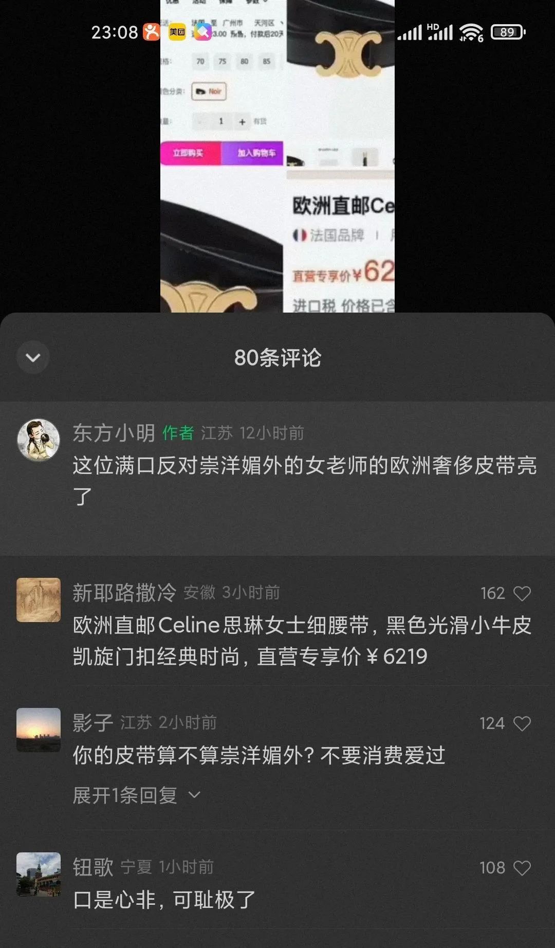 刚好手边有个读者发给我的视频,是一位女士正在慷慨激昂的发表讲话,说谁要是敢崇洋媚外,就不教他了,并报告给交长……下面的留言很精彩,有人说这位女士的腰带是欧洲某牌子的,价值六千多,也有人说她的衬衫、发型、香水、洗护用品都是西方发明的……