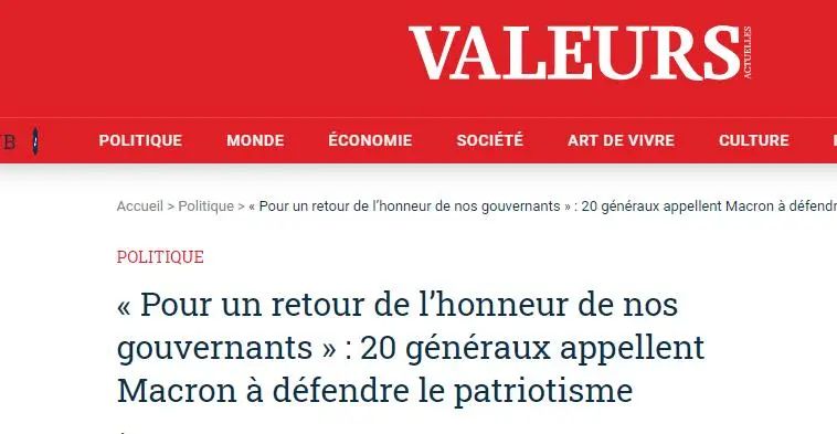 当时有1500名军人联名给马克龙上书(其中包括数十位将军),要求他出来捍卫“法兰西文化”和“法兰西精神”,并且指出法国很危险。