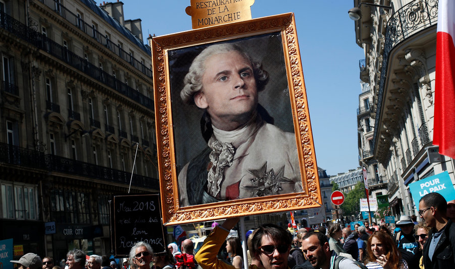 (2018年,法国“黄背心”们举着P有马克龙脸的路易十六画像上街)