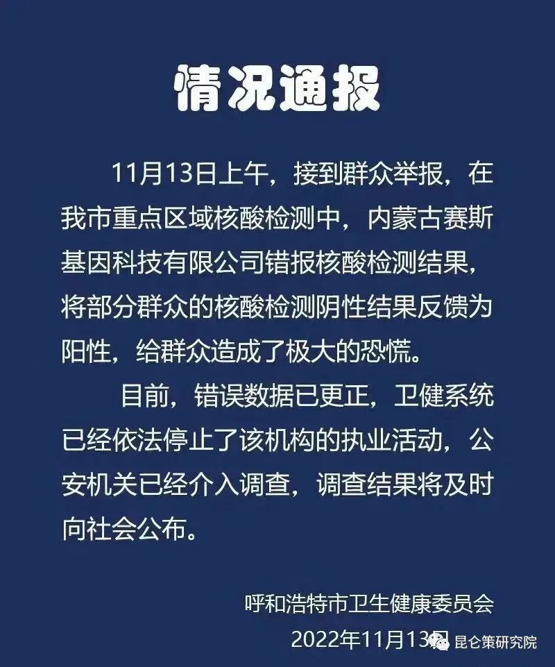 据呼和浩特市卫健委发布情况通报:11月13日上午,接到群众举报,在呼和浩特市重点区域核酸检测中,内蒙古赛斯基因科技有限公司错报核酸检测结果,将部分群众的核酸检测阴性结果反馈为阳性,给群众造成了极大的恐慌。