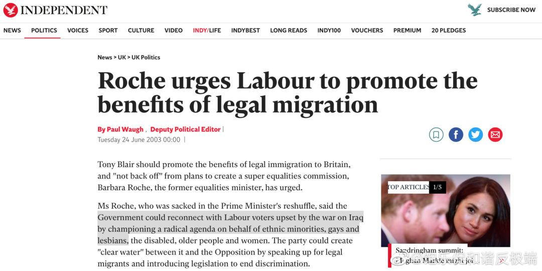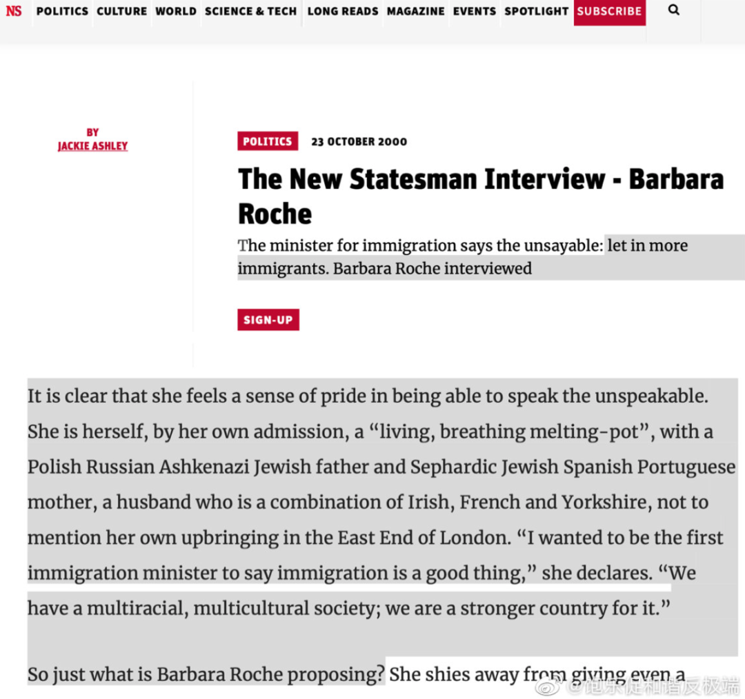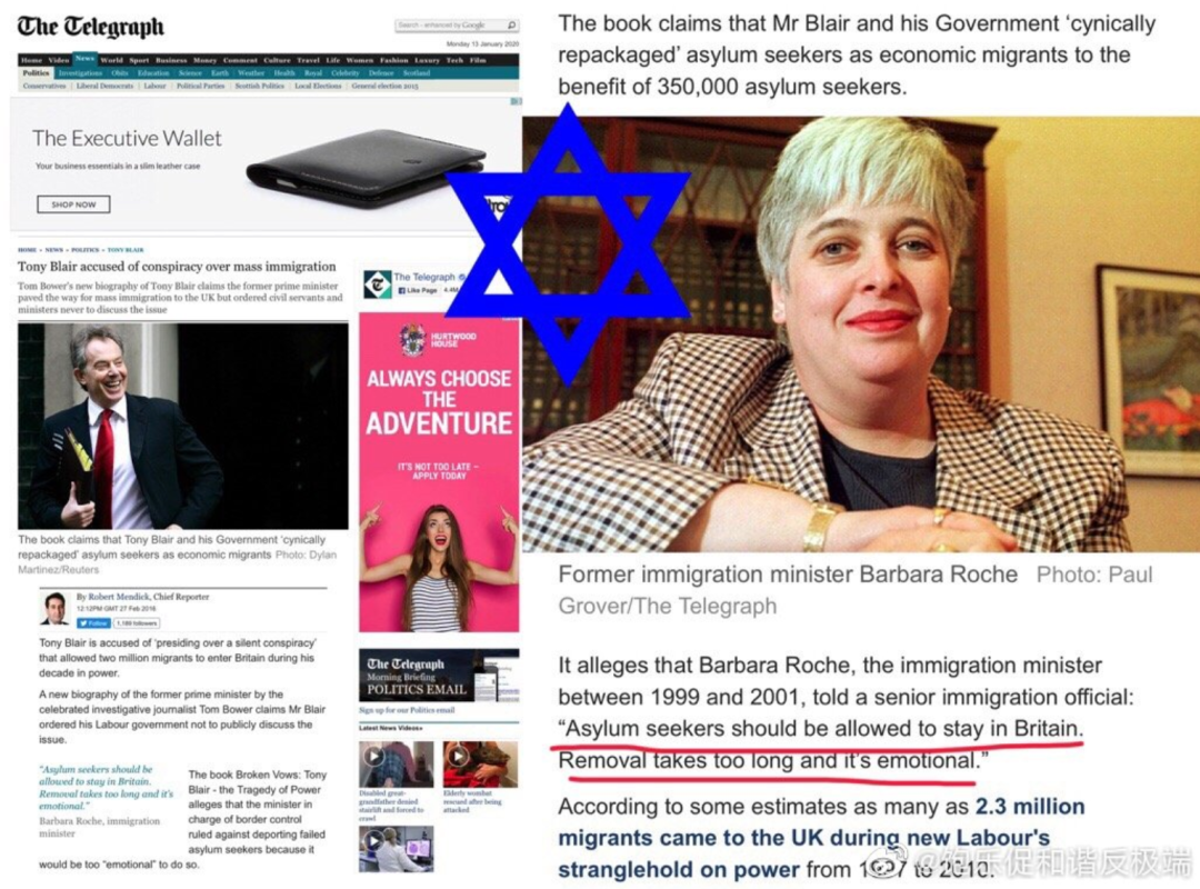布莱尔的移民政策的执行者和急先锋是:犹太人芭芭拉·罗氏 Barbara Roche,她时任移民事务大臣 Immigration Minister,曾命令难民可以留在英国,因为”遣返太耗时间而且令人情绪激动“。