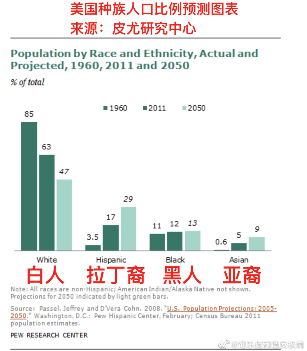 1960年美国的白人主体民族人口比例为85%。到2050年,竟仅会占47%,所有迹象都表明,即便美国从明天开始严格禁止所有新移民,由于白人的低生育率,这个趋势也不可逆转【数据来自皮尤研究中心】。