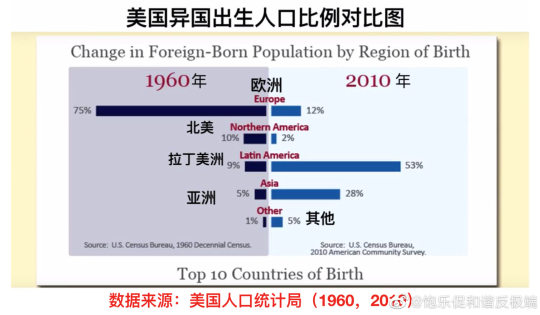 1960年(1965年移民法案通过之前),美国75%的异国出生人口都来自欧洲。但是到了2010年,这个比例仅为12%。而拉丁美洲出生的人口从9%上升到了53%,亚洲出生的人口则从5%上升到了28%【数据来自美国人口统计局】。