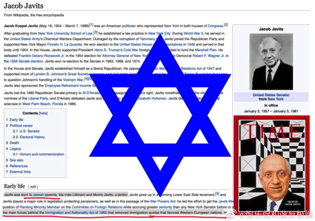 犹太精英在推动《1965 年移民法案》中的代表人物是当时的共和党议员雅各布·贾维茨 Jacob Javits , 他被认为是促使该法案通过的主要力量之一。