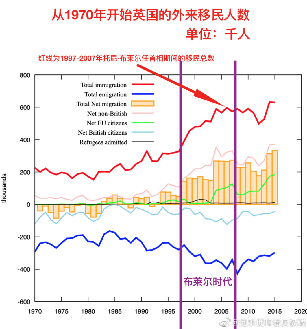 在英国的故事也是类似,在英首相托尼·布莱尔的工党执政期间(1997-2007),英国的外来移民数量直线上升,增加了超过230万人,也有数据称为300万人【下图非常直观的展现了布莱尔执政期间移民数量的飙升 】。