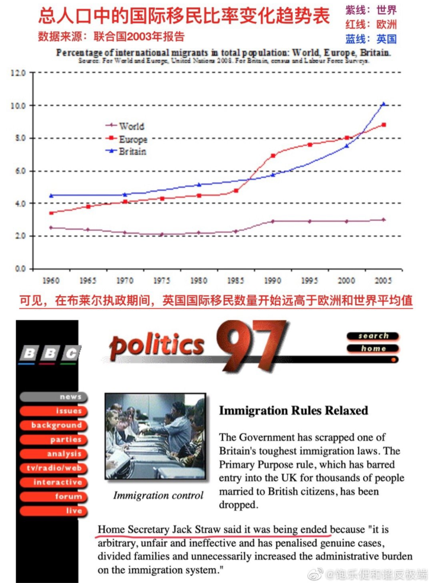 此期间英国的国际移民人数远高于欧洲和世界平均值。布莱尔上任一个月后,内政大臣,犹太人杰克·斯卓尔 Jack Straw就废除了首要目的规则 Primary Purpose Rule,使得英国居民外籍配偶更容易入境,这被认为是移民数量飙升的重要原因之一。