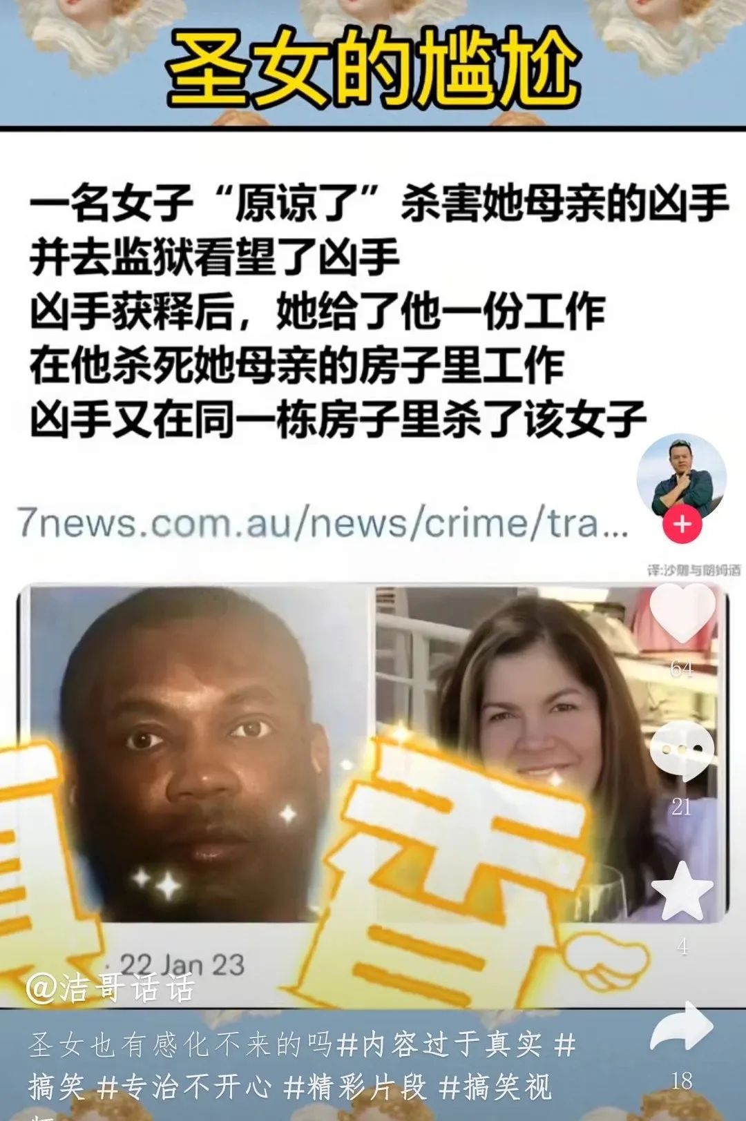 如今欧美的一些人,可以说是越来越变态了,圣母心泛滥就是其中表现之一。美国的一名女子,她的母亲被黑人男子杀害,她非但不痛恨他,反而去监狱探望他。23年后,该男子获释,她帮他安排工作,而工作地点就在他杀害母亲的房子里。她以为这样就可以“感化”凶手,却没想到凶手依然还是兽性大发,又将她给杀害了。