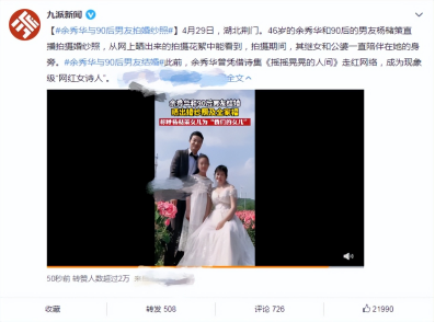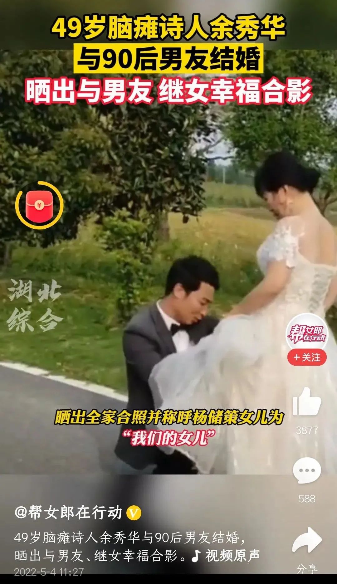 5月4日,据媒体报道,46岁的脑瘫诗人余秀华和90后男友结婚,余秀华还晒出和男友杨槠策的婚纱照,以及全家福,余秀华还晒出和男友、继女的照片,并称呼杨槠策的女儿为“我们的女儿”。