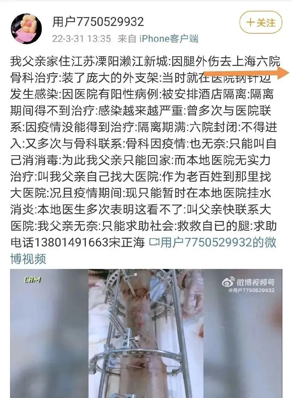 这是江苏溧阳的一位网友所发出来的,其父因腿外伤,装了庞大的外支架,发生了感染,急需要住院治疗。
