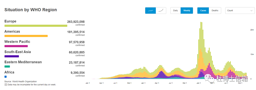 图1. 全球各地区新冠感染死亡病例趋势图