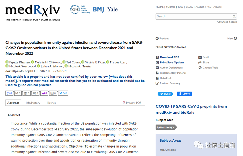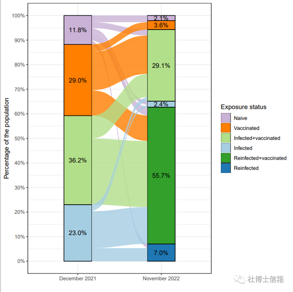 2022年11月20日,由哈佛、耶鲁和斯坦福三所美国高校的公卫学院在医学、临床和相关的健康科学领域的预印本资料库——medRxiv上传了美国人群针对新冠病毒变异株——奥米克戎免疫防御的最新研究进展——《2021 年 12 月至 2022 年 11 月期间美国人群对 SARS-CoV-2 Omicron 变体感染和严重疾病的免疫力变化(Changes in population immunity against infection and severe disease from SARS-CoV-2 Omicron variants in the United States between December 2021 and November 2022)》,见图2。研究模型显示,美国多次感染新冠病毒的人群占7%,多次感染新冠病毒+接种新冠疫苗的人群占55.7%,只感染一次新冠病毒的占2.4%,感染一次新冠病毒+新冠疫苗接种对的占29.1%,也就是说 94.2%的美国人曾经感染过新冠病毒。