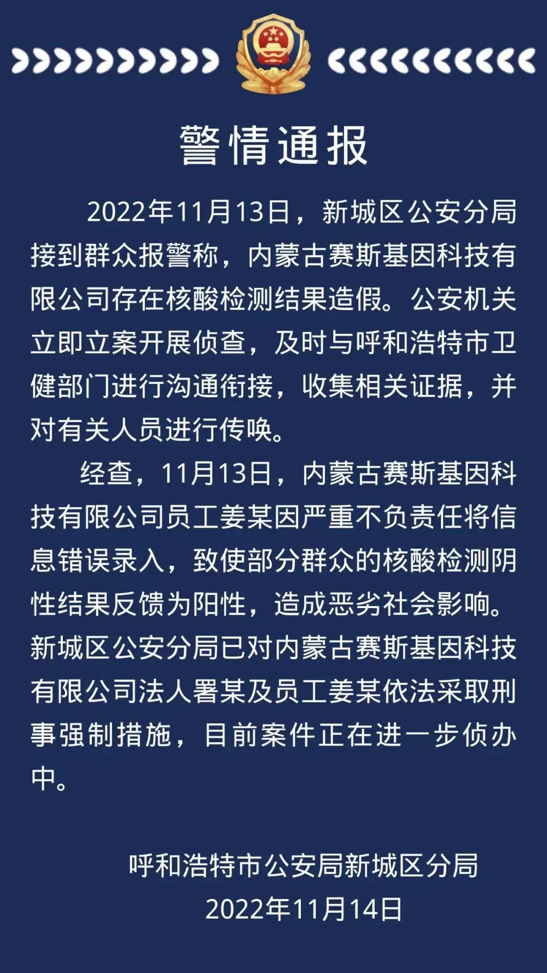 早在张sir陷入困惑之前,内蒙古有家赛斯基因科技有限公司,因为核酸结果造假,警方不得不出动逮人:
