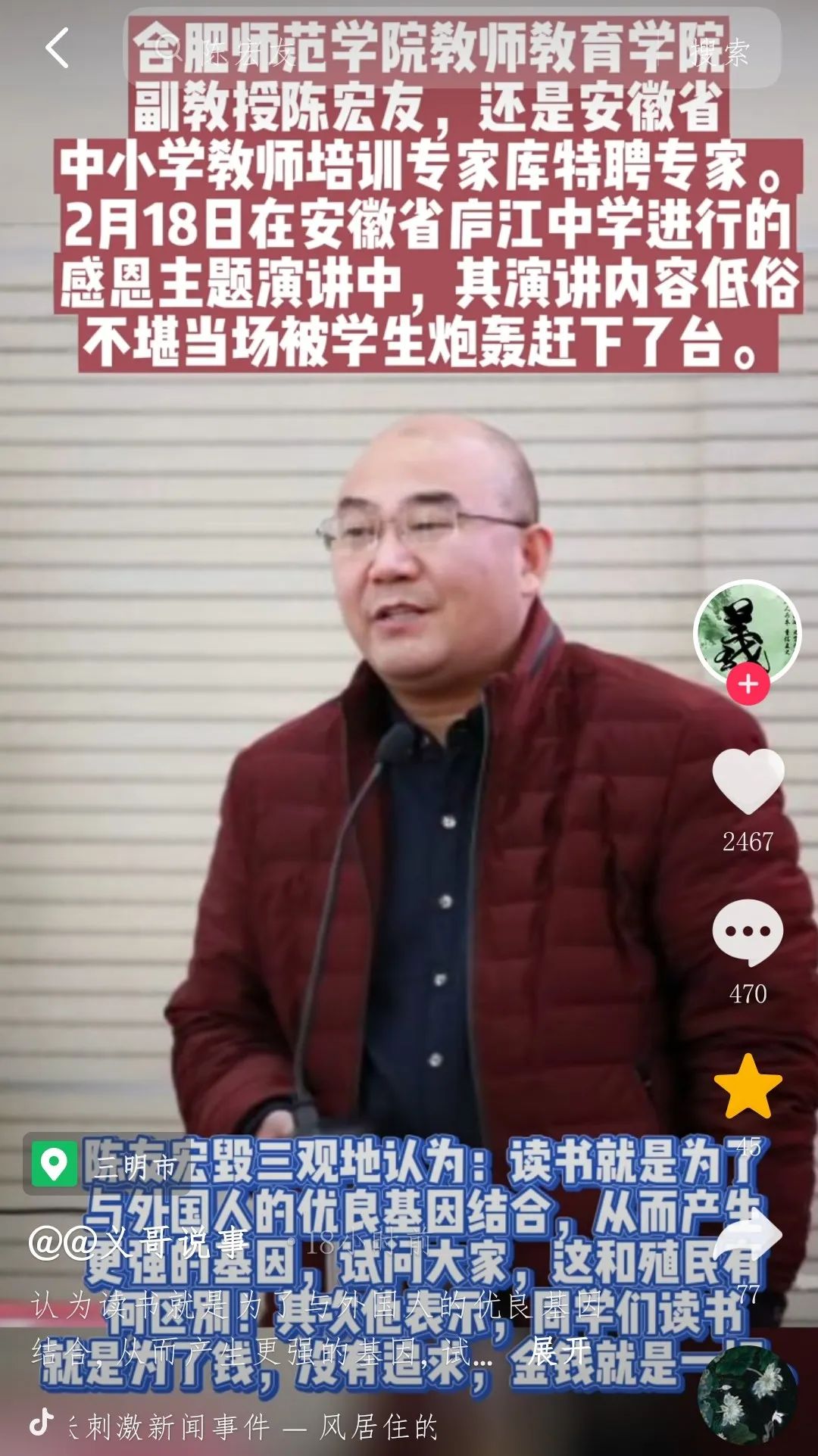 今天笔者在抖音上看到这样的一则视频,2月18日下午,合肥师范学院教师教育学院副教授陈宏友前往安徽省庐江中学进行的感恩主题演讲。陈宏友所讲的言论十分的低俗,他竟然说读书就是为了与外国人的优良基因相结合,从而产生更强的基因。
