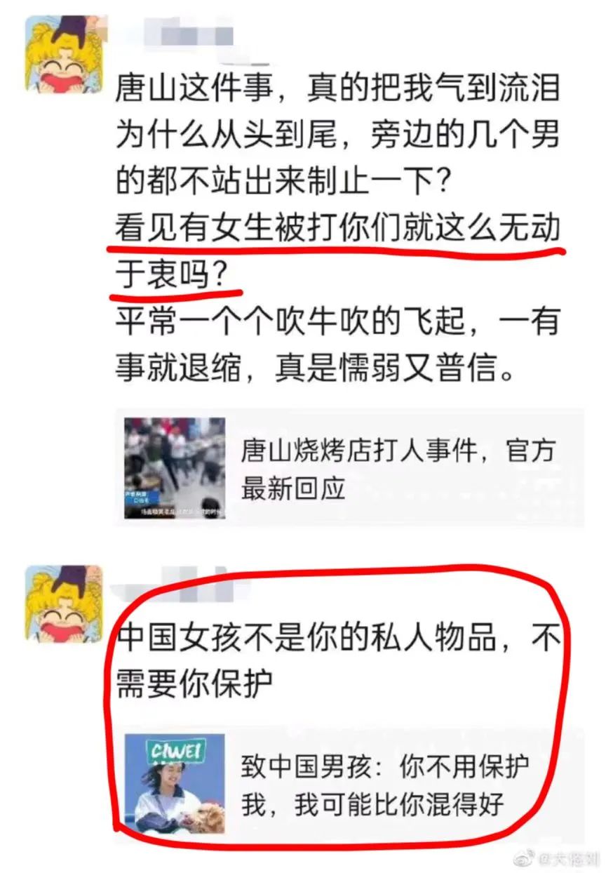 这次的唐山事件又让不少女拳分子高潮了,好不容易逮着一个机会,他们自然是不肯放过的。于是乎,我们在网上看到了无数人疯狂地叫嚣“杀光男人”,要求男人“全部去参军”,还有一些男性莫名其妙地说什么“羞愧”,真不明白有什么好羞愧的。近年来,女拳可以说是越来越疯魔,渗透进了我们生活的方方面面,就连象牙塔也未能幸免。君不见,“清华腚姐”想要“社死”学弟;君不见,华东理工大学,女生偷耳机反而倒打一耙;君不见,北京师范大学女生禁止男生坐电梯,甚至于扬言要骟了男生;君不见,广药女生因为琐事拿玻璃瓶砸男生后脑勺;君不见,准研究生疯狂叫嚣“随机捅死一个男人”;……
