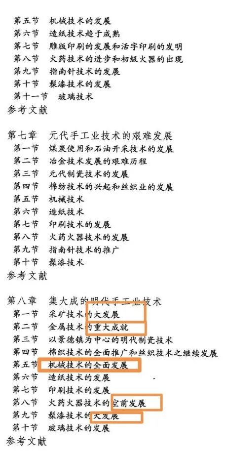 只要看里面各朝代的标题:秦汉手工业技术的蓬勃发展、魏晋南北朝手工业技术的缓慢发展、隋唐五代手工业技术的发展、南宋手工业技术的繁荣、元代手工业技术的艰难发展、集大成的明代手工业技术、清代早中期手工业技术的缓慢发展……