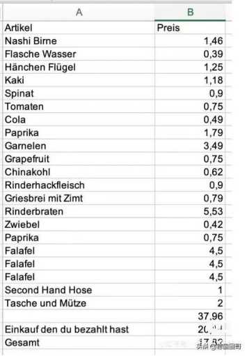 这是一位女性和德国男友分手之后,男方给她寄来的一份账单,可以看到大部分花销是吃饭,包括不限于1.18欧、甚至低至0.39欧的Essen项;布丁、三明治都在列,还有1欧的裤子和2欧的裙子。