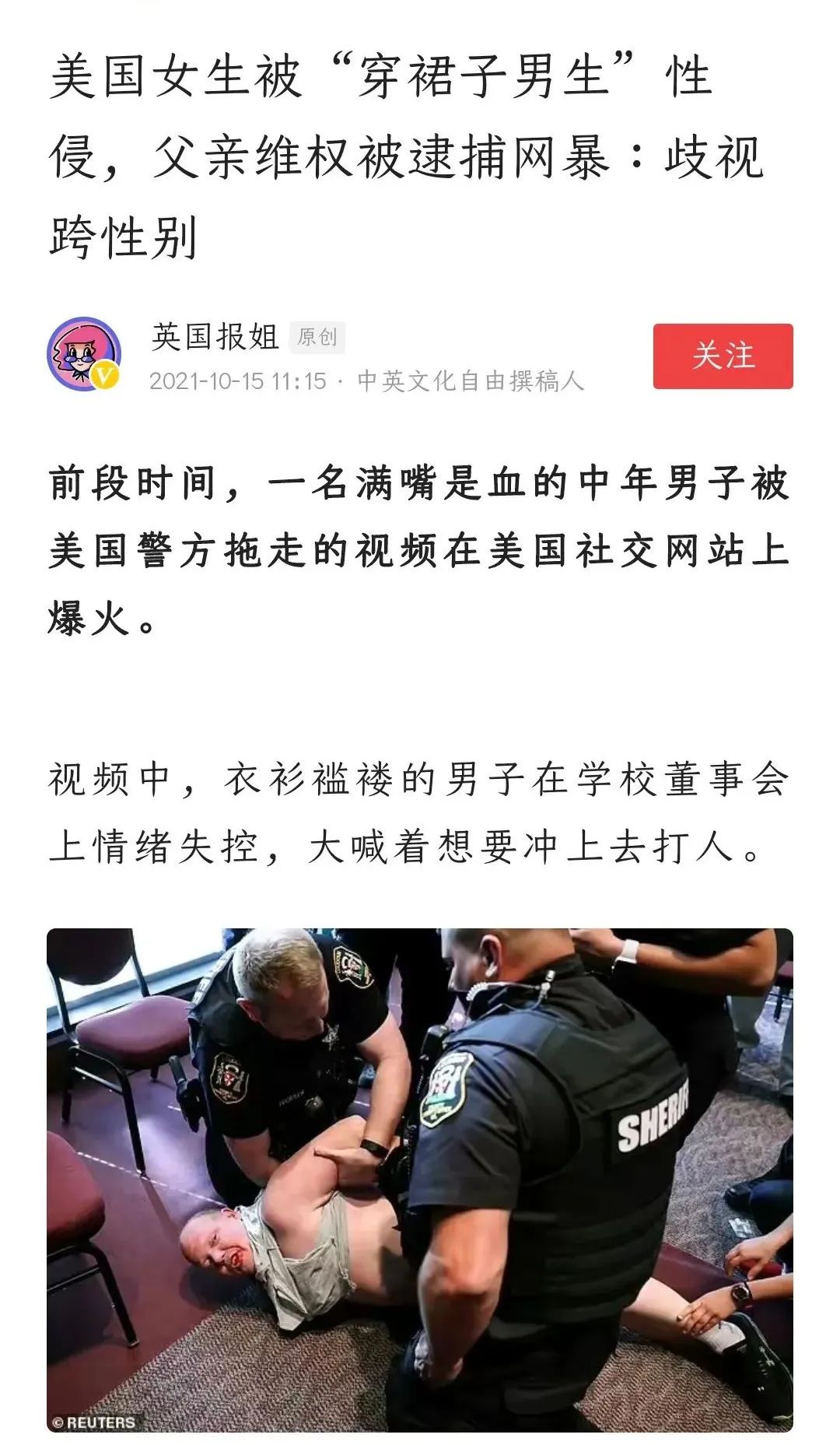 还发生了一名穿裙子的男生进入女生厕所,连续性侵了好几名女生,女生父亲出来维权,反而被当成了恐怖分子;