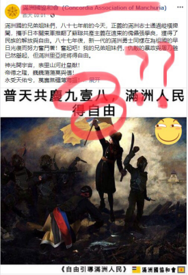 这幅图套用的是法国画家欧仁·德拉克罗瓦为纪念1830年法国七月革命而创作的一幅油画《自由引导人民》。很明显,这些人认为日本人发动的“918事变”给东北人民带来了“自由”。明明给东北人民带来了极大的灾难,可这些人却颠倒黑白,说什么这是满洲人的大幸,真是恬不知耻到家了!对于日寇在东北的倒行逆施,任何一个有良知的中国人都不会忘记,我们至今依然记得“平顶山惨案”(1932年9月),“731部队”的令人发指的罪行。在辽宁省阜新市孙家湾南山,矗立着一座巍峨的纪念碑,碑上刻写着“忆沧桑史,记血泪仇,罪证昭然。慷慨殇歌化警钟,盛世唤和平”的铭文,纪念碑周围苍松翠柏环绕,庄严肃穆。