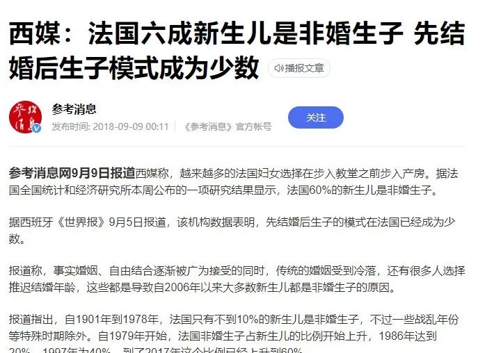 那好,那就不结婚。于是乎,私生子比例大幅上升,法国18年非婚生子比例超过60%!