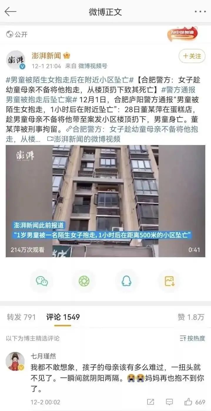 再比如说合肥一女性,深受女拳影响,竟然诱拐一岁男婴,并将其从高处下摔下来,造成男孩多处脏器损伤,最终痛苦地死去。