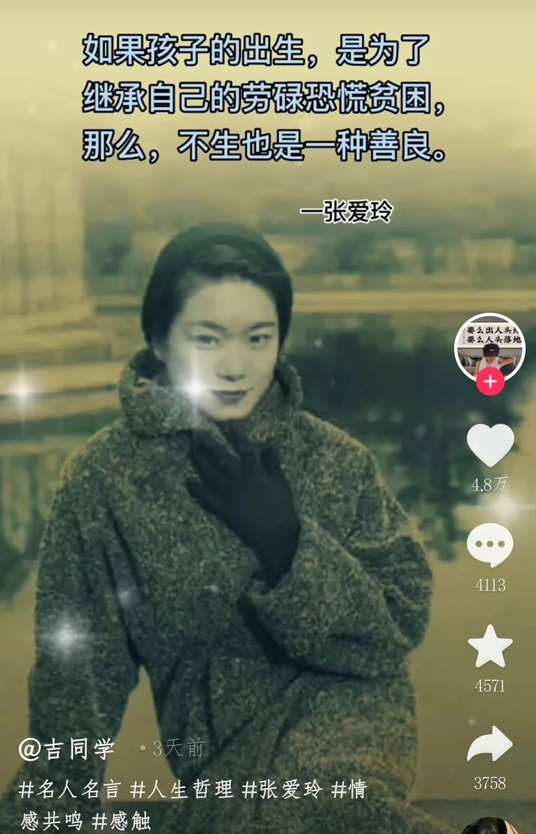 (胡兰成和张爱玲合影。如果张爱玲真有家国情怀,又怎么可能会和胡兰成这样的大汉奸结婚呢?)而抗战时期,我们的人民过着怎样的生活呢?我们前线的将士们又过着怎样的生活呢?依张爱玲所说,如果继承了父辈们“劳碌、恐慌、贫困”,那么这些人就不应该出世,就不配拥有生存权、生命权和生育权。那么,在抗战时期,恐怕也就只有那些个贪官污吏以及投靠日本人的汉奸有资格生存于世了,广大的劳动人民以及前线的抗战将士,根本就没有资格生存于世了!为了支持全民抗战,广大的劳动人民过着朝不保夕的日子,不仅自己的生存已然是难以维系,还要勒紧裤腰带支援前线;而前线的将士们,每天都生活在战火之中,他们的伙食十分的粗劣,许多人甚至穿着单衣单裤,穿着草鞋,拿着极其简陋的武器,在和日寇做殊死搏斗。美国的一位记者曾经采访过一名身着草鞋的士兵,问他这样的穿着,到了冬天又要怎么办呢?为了抵御日寇,无数华夏好儿郎战死沙场、马革裹尸,他们的日子难道不是“劳碌、恐慌和贫困”更为糟糕吗?既然连“劳碌、恐慌和贫困”的人都已经没有了生存权、生命权和生育权,又遑论他们呢?而那些贪官污吏们和投靠日本人的汉奸们,却过着纸醉金迷的日子,就像张爱玲所写的小说《色戒》里所说的那样,他们不仅能够吃饱穿暖、能够给全家优渥的生活,还能够在外面搞小三,给小三买奢侈品。正是因为这些个贪官污吏和汉奸狗贼的破坏作用,增加了华夏儿女抵御日寇的难度,无数人也因此死于非命!我们本可以不用那么辛苦的!但这些个民族败类们,又哪里有半点对同胞苦难的感同身受呢?华夏文明能够有今天,所依靠的正是广大劳动人民的辛勤劳作。不管在任何时候,有权有势的、能够过着潇洒惬意的生活的人,终究只是极少数,大多数人都必须生活在“劳碌、恐慌和贫困”之中。设想一下,如果大多数人都因为“劳碌、恐慌和贫困”,都不再结婚生子,那么我们这个国家和民族,由谁来传承?不要忘记了,富人的孩子也会分层,没有穷人,富人的孩子大多数就会沦为穷人,然后又不配生存于世……依这个逻辑,不出数十年,华夏文明就应该彻底消失了,这片土地也将会由别的族群的人所占据。如果是这样的话,那么先烈们又何必豁出所有的一切,和侵略者做殊死搏斗呢?他们那么辛苦,付出那么大的牺牲,不就是希望华夏文明能够永存,子孙后代能够永远占据这片土地吗?可如今却有一些人想要我们民族断子绝孙,彻底葬送数千年来我们无数仁人志士的努力,这样的一种行径,对得起他们吗?