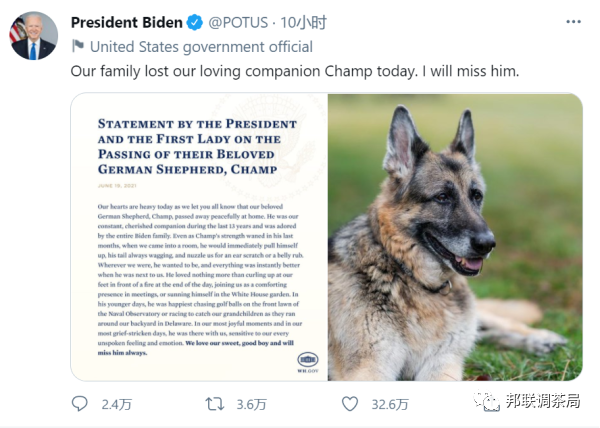 (作为总统,拜登利用白宫的工作平台发布自家狗的死讯,这真的合适吗?某些政客为了作秀,真的是毫无下限!台湾的蔡某人置因为劣质疫苗而惨死的数百台湾民众生命不顾,第一时间吊唁拜登的狗,真的是丧尽天良、愚蠢至极!)