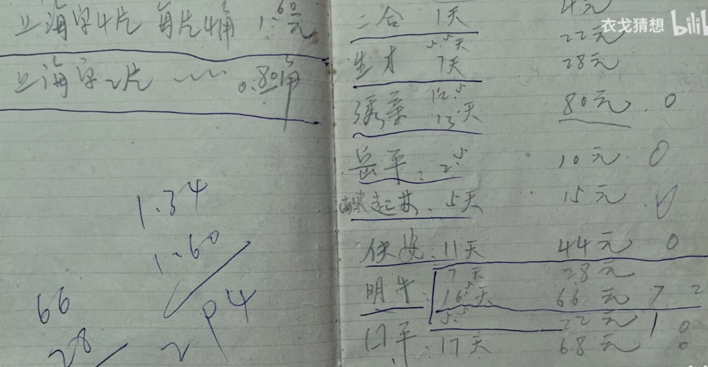 在二舅的账本上,清楚记着每次出工和赚到的钱: