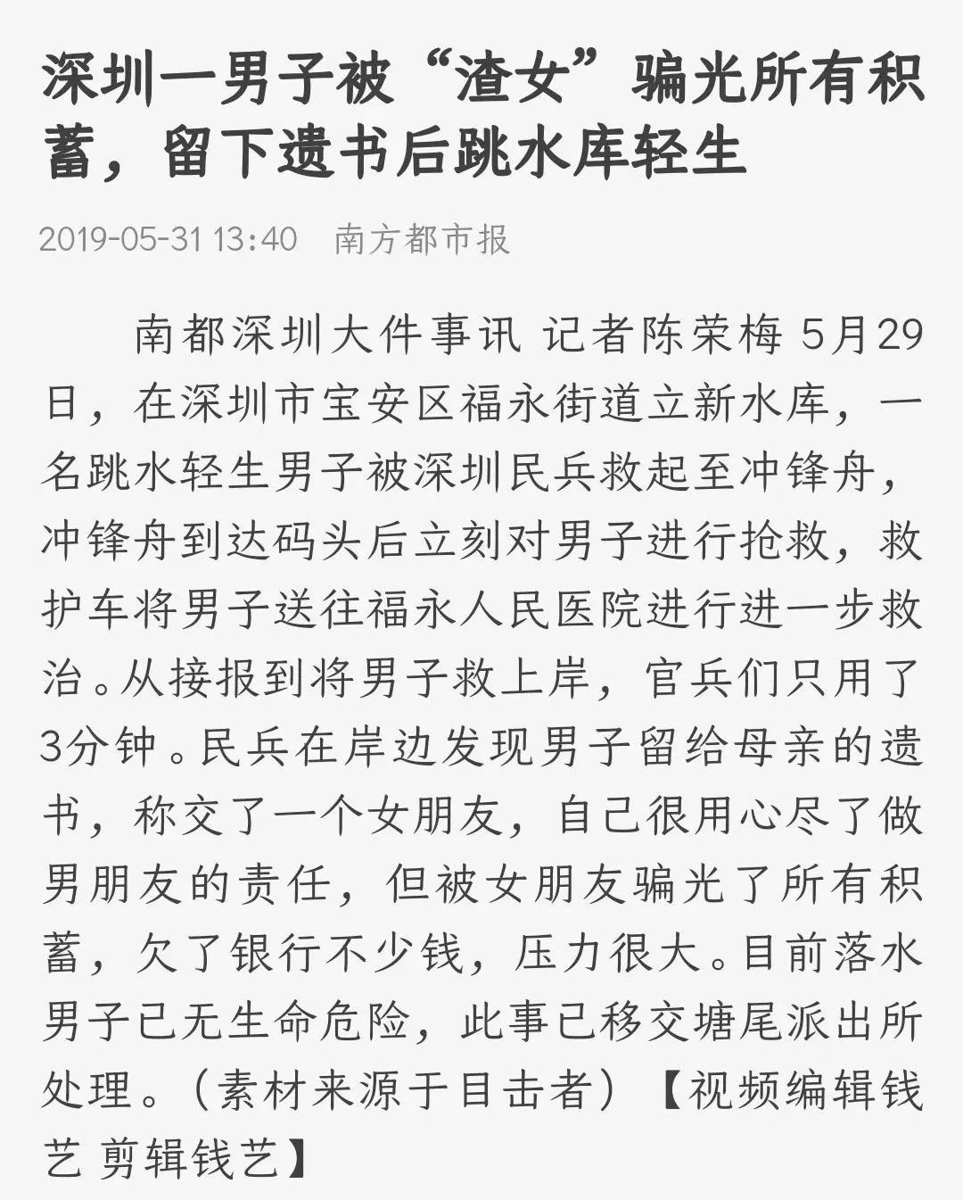 (男子被渣女骗光财产而轻生)
