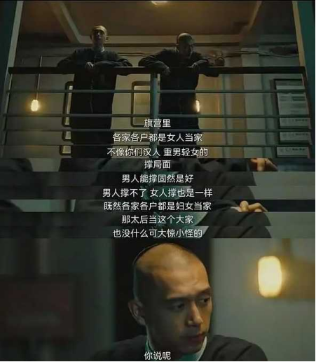 其台词包括:「我们旗人从来不做告密的事 」「我们旗人男女平等,女人当家,不像你们汉人重男轻女」「我们旗人吃饭穿衣的礼仪,都是从小培养的」「我们旗人祖先都是巴图鲁,不是弱书生。」……