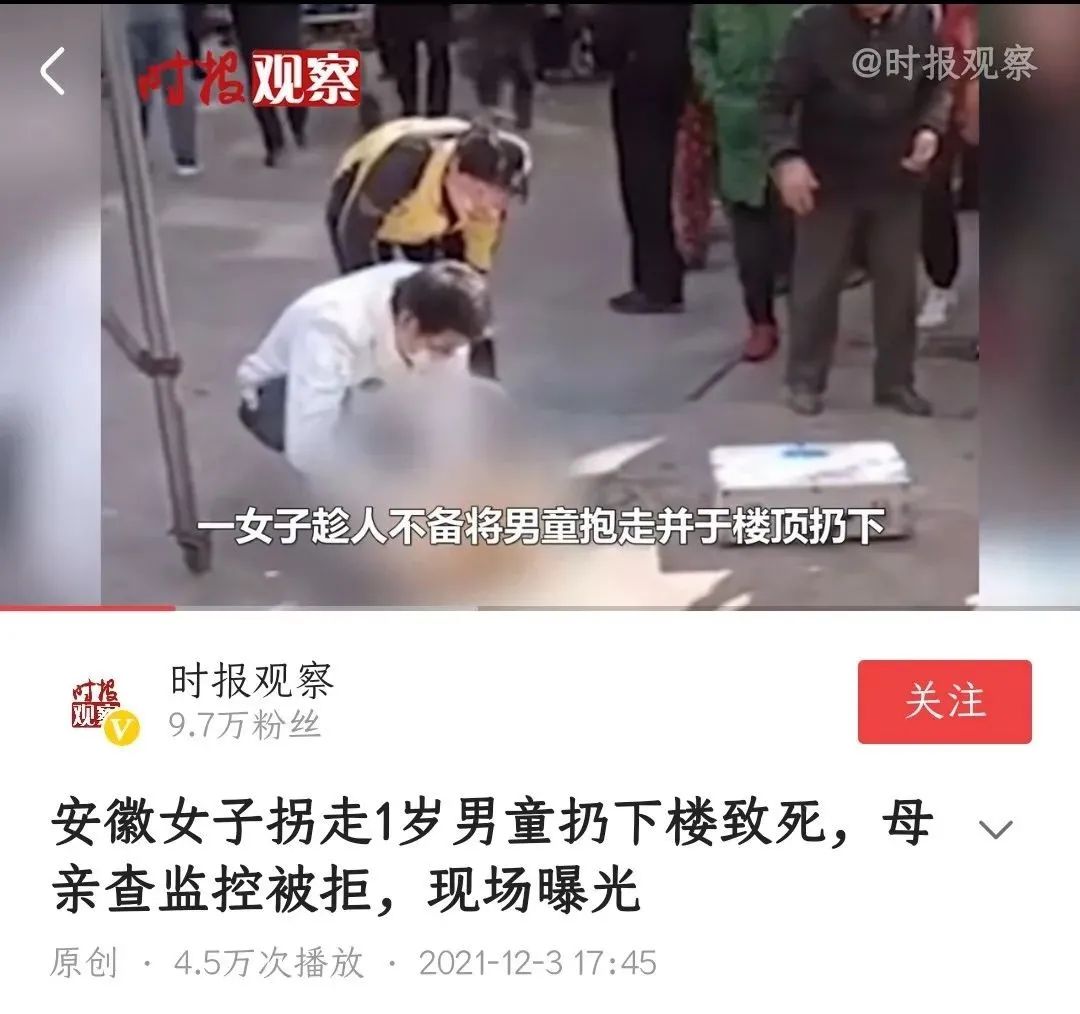 一个多月前,还有一位极端女拳分子诱拐了一名一岁男童,将孩子从高楼上扔了下来,可以说是丧心病狂!