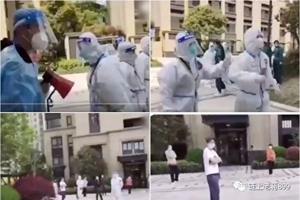 上海一小区拒绝做核酸检测,居委会(上排)喊冤哭诉。小区楼长(下排)站在楼前保护楼内居民免遭打扰。(视频截图)