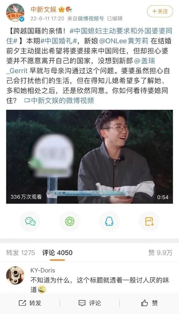其实像陈宏友这样的鼓吹“杂交”、“融合”的人,比比皆是,甚至可以说是成为了一种潮流。国内互联网各平台经常有人带路宣扬美化中外通婚,比如说今年春节当天,歌颂中外通婚,微博热搜第三,一个评论没有,点赞数不到一千,明显是买的热搜;和2022年6月12日微博热搜第二【跨越国籍的亲情!#中国媳妇主动要求和外国婆婆同住# (到中国同住)】一样,一看也是买的。