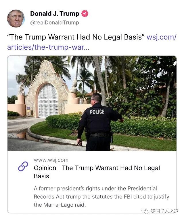 (华尔街日报发表文章,称“对川普的搜查令没有法律根据”)