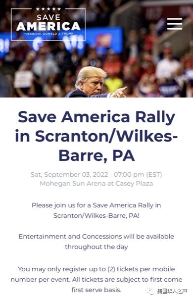 历史关头,川普总统将于9月3日在宾州的Wilkes-Barre/Scranton举办大型集会,支持共和党候选人决胜中期选,推进美国优先各项进程。