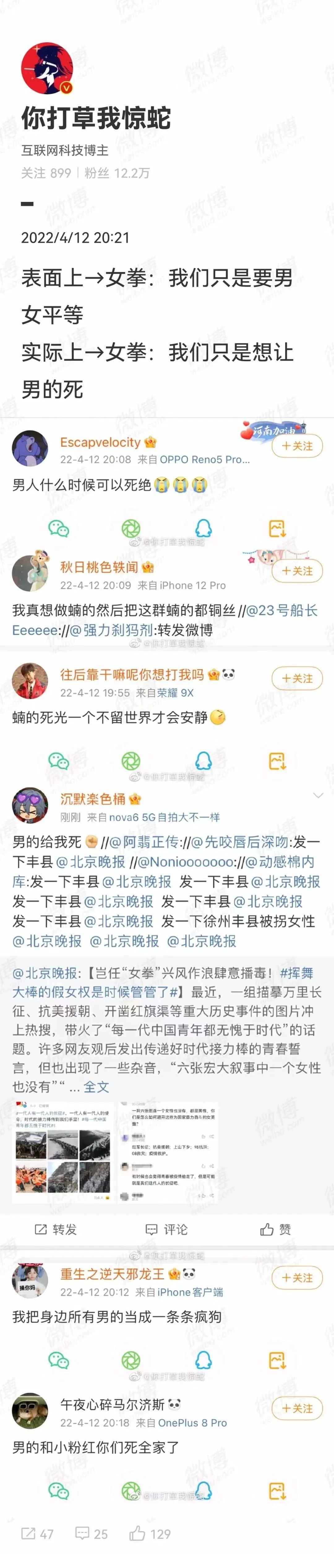 我们希望全体同胞携起手来,一起将女拳分子打倒,让持有这种思想的人在社会上无法立足,清除这种思想毒瘤!