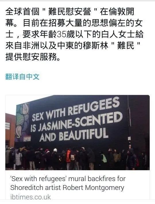 然而,现实的报应很快就来了,这些个难民个个都不是省油的灯,一方面拿了无数好处(衣食住行全免,每月还能有不菲的零花钱),另一方面却又视当地民众为眼中钉、肉中刺,非得要想尽一切办法除掉他们。于是我们看到了这样的一幅景象,难民们在市中心形成了“国中之国”,他们的犯罪率十分的高昂,从小偷小摸到绑架、抢劫,再到杀人越货、贩毒、恐怖袭击,可以说是无恶不作。另一方面,则是欧洲本土居民的族群撕裂,受白左思想的影响,许多人对于这些难民有一种特别的偏爱,不管他们做了什么,这些圣母总能找到理由为他们开脱。每次出现了难民性侵本国女性的事情,圣母们第一想到的不是去安慰受害者,而是想着帮难民们开脱,甚至还有人站出来给难民道歉,说是因为本国人的“种族歧视”,没有对他们足够关心,这才让他们犯下了这样的事情。甚至于,这些个白左圣母还搞了一个“难民慰安营”,专门招募35岁以下的白人女性,其目的就是给来自非洲和中东的难民提供慰安服务。