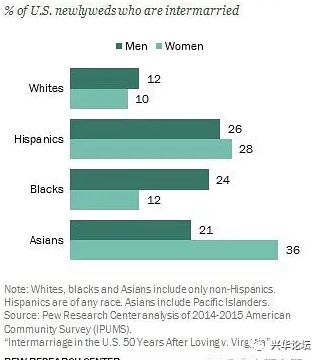 有个婚恋调查里面的数字完全不可想象,统计2014-2015年,亚裔女性外嫁的比例是四个种族之最!而且这里的统计包括了本地人和新移民的婚姻综合情况,考虑到新移民内嫁的概率远高于本地人,本地(二代)亚裔的外嫁率不知道要有多高!而且别忘了,婚姻数据只能统计外嫁“成功”的,无法统计外嫁“失败”的情况,那么亚裔女性有跨种族关系的比例到底有多少呢?我也没找到统计结果,但是,从个人经验来看,极多,超级多。