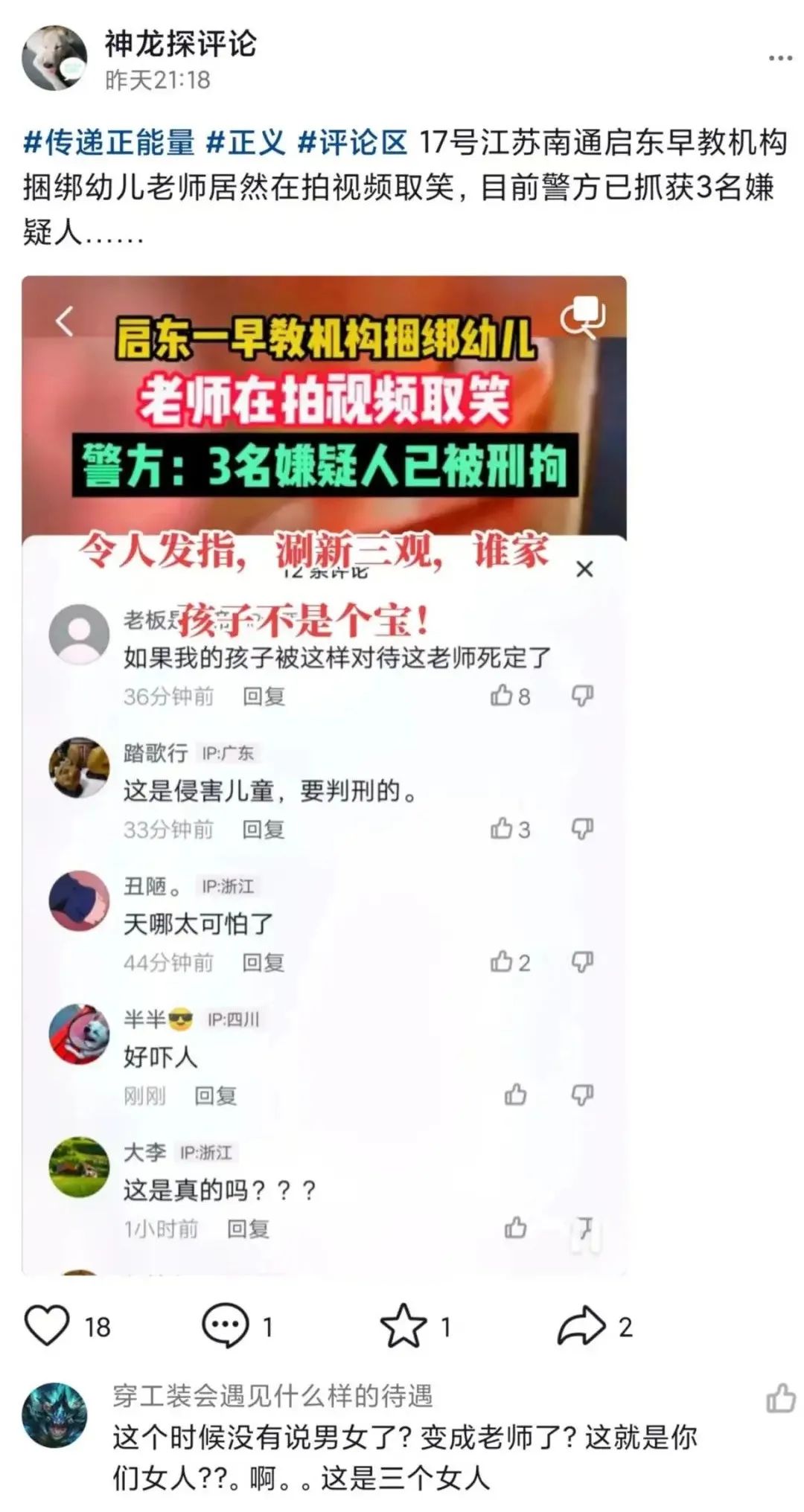如今,极端女权已经上升到伤害男性身体了,而且他们竟然认为这是理所当然,不以为下、反以为荣,真真是让人不寒而栗!对于这种情况,我们绝对不可以妥协,因为我们普通人有一半是男性,即便是女性,我们也有父亲、兄弟、丈夫和儿孙,他们都是我们的骨肉至亲,都是我们极其重要的人,我们又怎么可以任由他们处于极端女权的恐吓之中呢?人人生而平等,不能因为犯罪分子是女性,就大事化小、小事化了!对于如此暴戾的虐童事件,绝对不可以姑息,否则后果不堪设想!