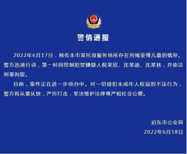6月17日,江苏南通,网曝启东运动宝贝中心,一名学生双手被绑在门上,另一名学生被捆绑躺在床上,疑似老师的女性在一旁拍视频取笑。