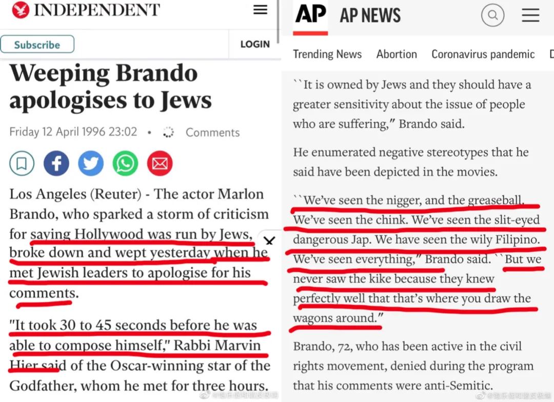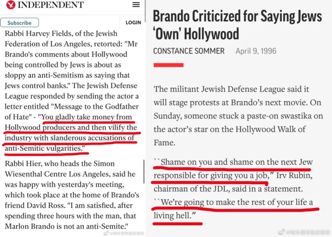 教父影星马龙·白兰度怒斥犹太双标:控制好莱坞的犹太人丑化其他民族,唯独偏袒美化犹太人形象。