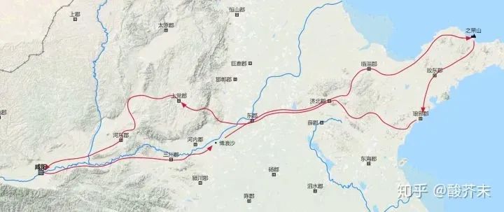 知乎上有人制作的始皇第三次巡游路线,在该图中,博浪沙在大河之南,如今的古博浪沙遗址在黄河之北。